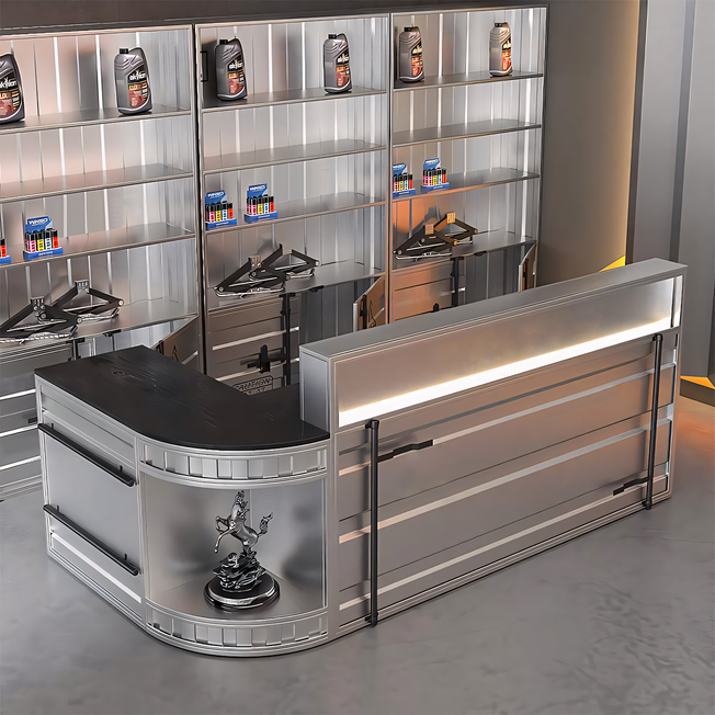 Chic Stainless Steel Checkout Counters Salons Reception Desk JDT-1043 This design features stainless steel counters and cash registers, emphasizing a sleek and modern aesthetic suitable for fashion stores, hair salons, and beauty parlors. Characterized by fresh stainless steel materials,...