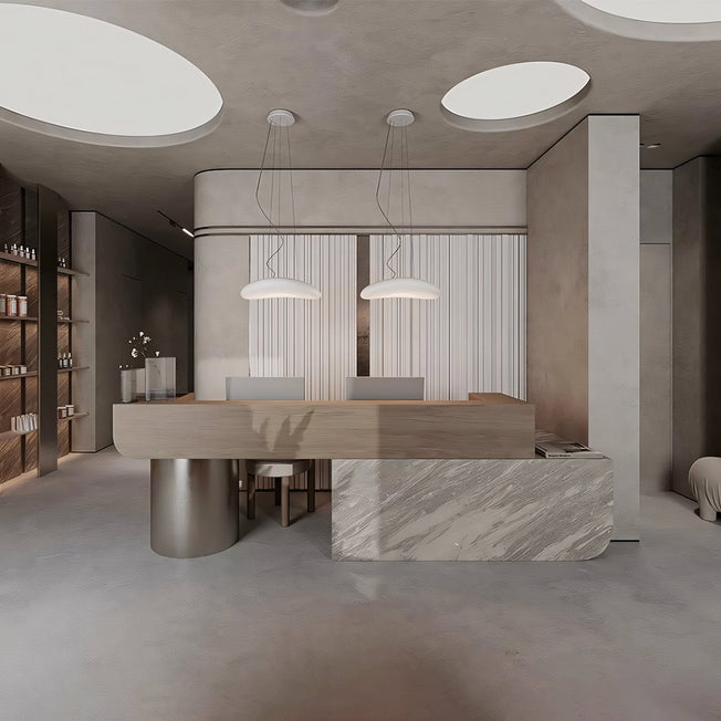 Chic Modern Semi-Circular Bar Counter Cashier Desk JDT-1104 The front desk of the store is a stunning visual focal point, adopting a trendy and minimalist modern design with a clever semi-circular arc shape that exudes fashionable taste. This...
