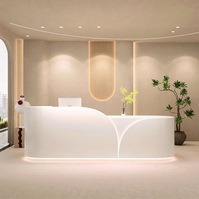 Fully Assembled Curved LED Reception Desk for Salon Spaces JDT-1037 Showcasing a unique allure, this luxurious reception desk is ideal for beauty salons, clothing stores, and corporate front desks. With its sleek modern design and curved lines, it seamlessly integrates...