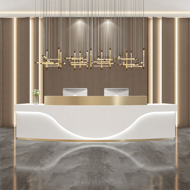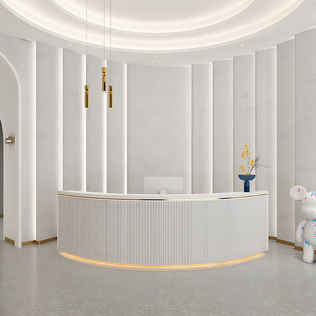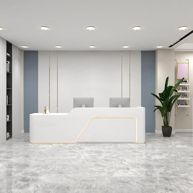 Elegant Minimalist Reception Counter with Spacious Desktop JDT-7284 Still searching for a practical and high - aesthetic reception desk? Check out this one! It is fully assembled, which makes the installation a breeze. The unique arc shape features...