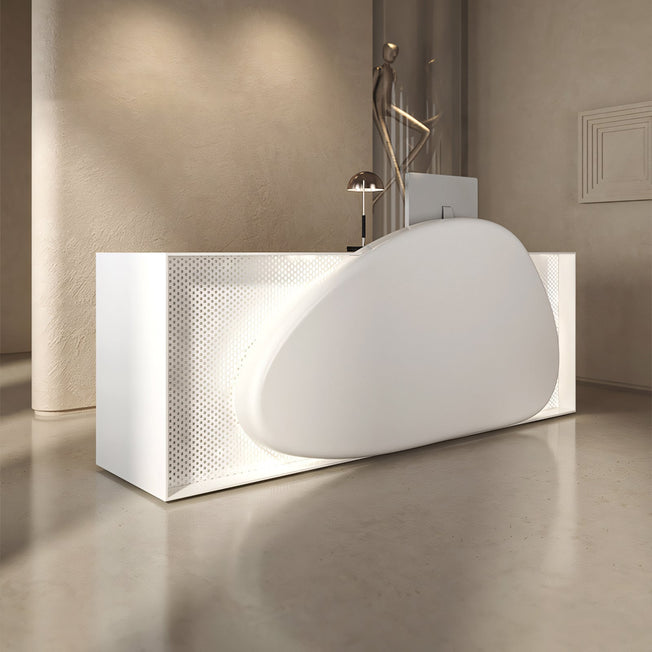 Elegant Minimalist Fully Assembled Reception Desk with LED Lights JDT-2013 The White Lacquered Arc-shaped Counter is a masterpiece of elegance and functionality. Its distinct arc shape gives a soft, inviting look and uniqueness to your reception area. Crafted with high-quality...