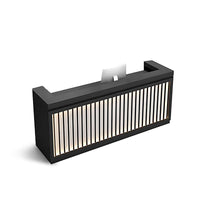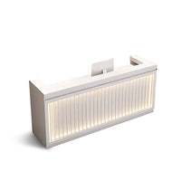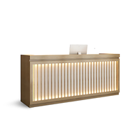 This oriental-style reception desk cleverly combines traditional elements with modern design. The tabletop is made of high-quality materials, strong and durable, and can easily hold computers and other office supplies. The vertical stripes on the facade are matched with soft built-in LED light strips to create a warm and layered atmosphere. The circular decorative painting on the background wall is a landscape pattern, exuding a unique oriental charm.